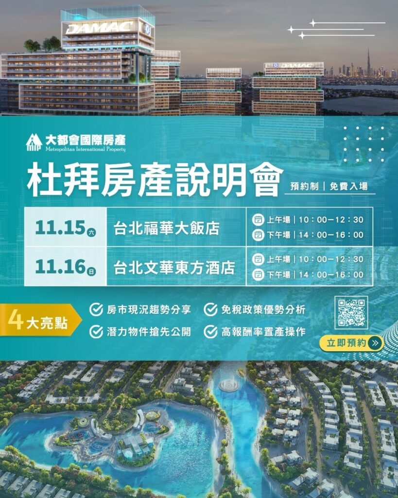 本次說明會由大都會國際房產,大都會國際移民,杜拜華夏地產攜手杜拜頂尖精品建商Damac達馬克強強聯手共同舉辦。將帶來第一手建案資訊與市場分析,掌握杜拜房市核心脈動,並與專業房產與移民顧問為您量身訂製身份與資產雙重規劃。同時,也將與建商代表直接面對面交流,獲得獨家方案與限量投資機會。